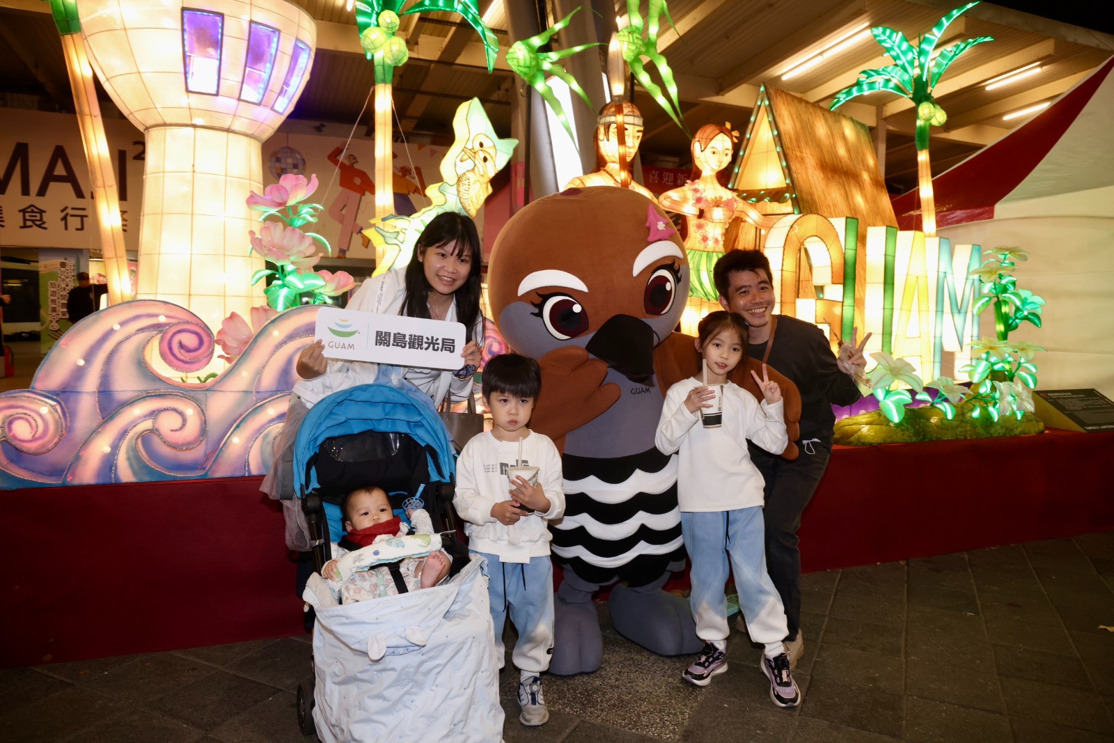 台北燈會花博園區,聖啟斯及維尼斯大使范東亞在花燈前,彩裝與小朋友互動。廖瑞祥攝