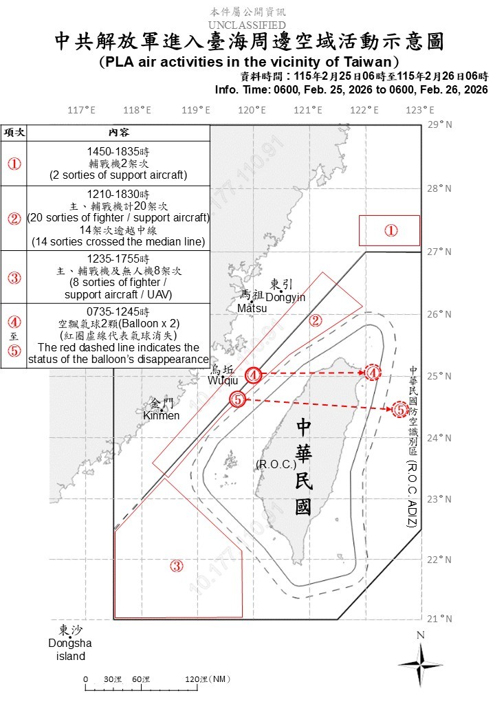 國防部2026.2.26發布中共解放軍在台海周邊動態。國防部