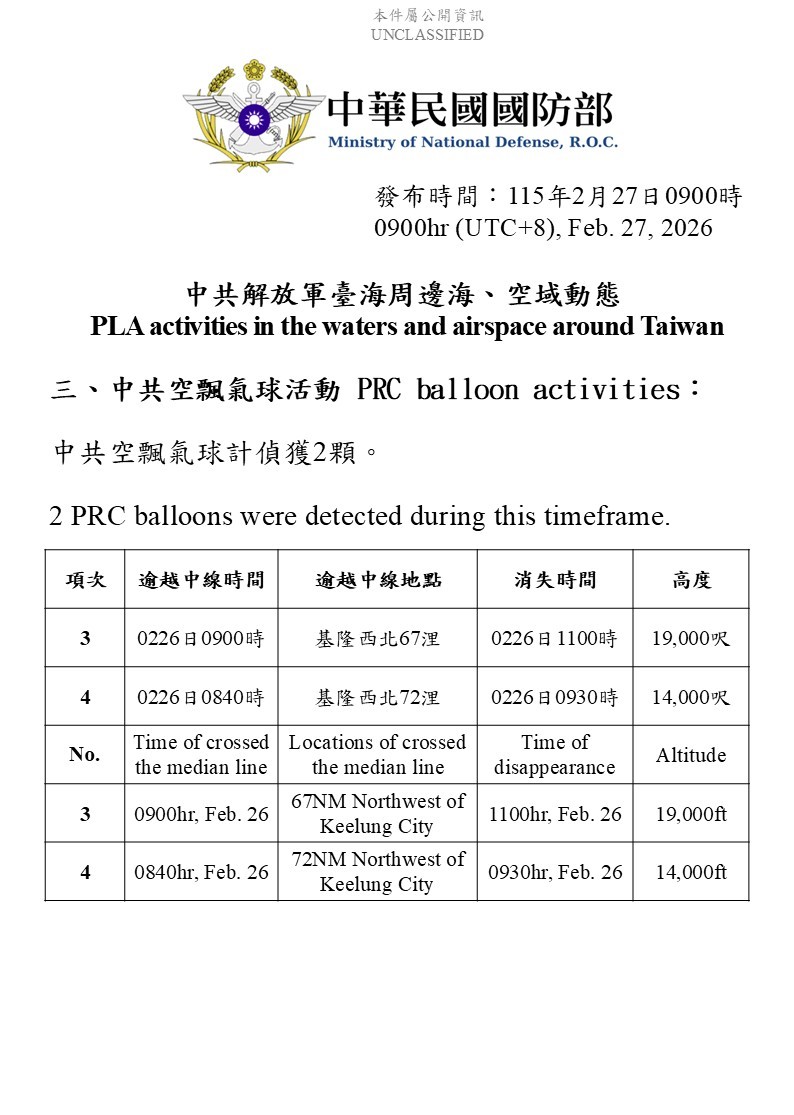 國防部2026.2.27發布中共解放軍台海周邊海、空域動態,從2.26上午6時起至2.27上午6時止,偵獲共機8架次(逾越中線進入中部及西南空域6架次)、共艦6艘及公務船1艘,持續在台海周邊活動,並有2枚空飄氣球逾越台海中線。國防部