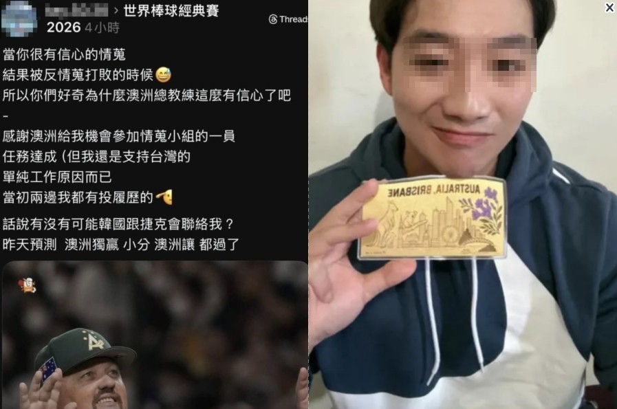 2026世界棒球經典賽(WBC)台灣隊昨遭澳洲對3比0完封,球迷情緒低落,賽後一名網友跳出來說自己幫澳洲隊情蒐,引發網友撻伐。此人被起底,這名陳姓男子疑似是國民黨員林市民代表張詠勝的助理,張詠勝今(3/6)緊急澄清,陳男並非其正式助理,只能算是「朋友的好朋友」,其行為與他無關。