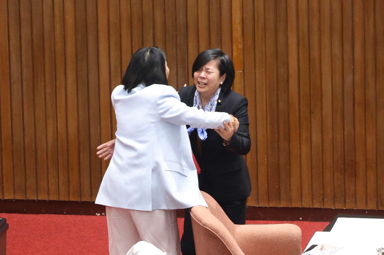 立委李貞秀立院首次發言,激動落淚與同黨立委周春綢相擁。李政龍攝