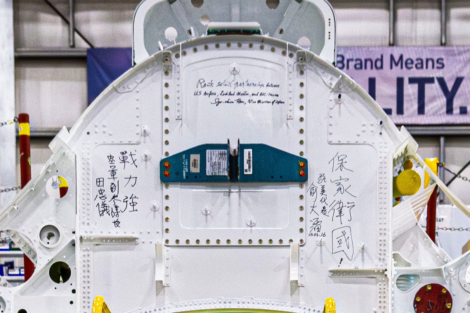 國防部軍政副部長徐斯儉2026.3.16於美國洛馬公司生產線組裝中的F-16 Block 70(亦稱F-16 V構型)機體結構上以英文書寫台美與洛馬的夥伴關係「堅若磐石」,空軍副參謀長田忠儀少將寫上「戰力強」、駐美大使俞大㵢寫上「保家衛國」等詞語,為空軍加油打氣。青年日報