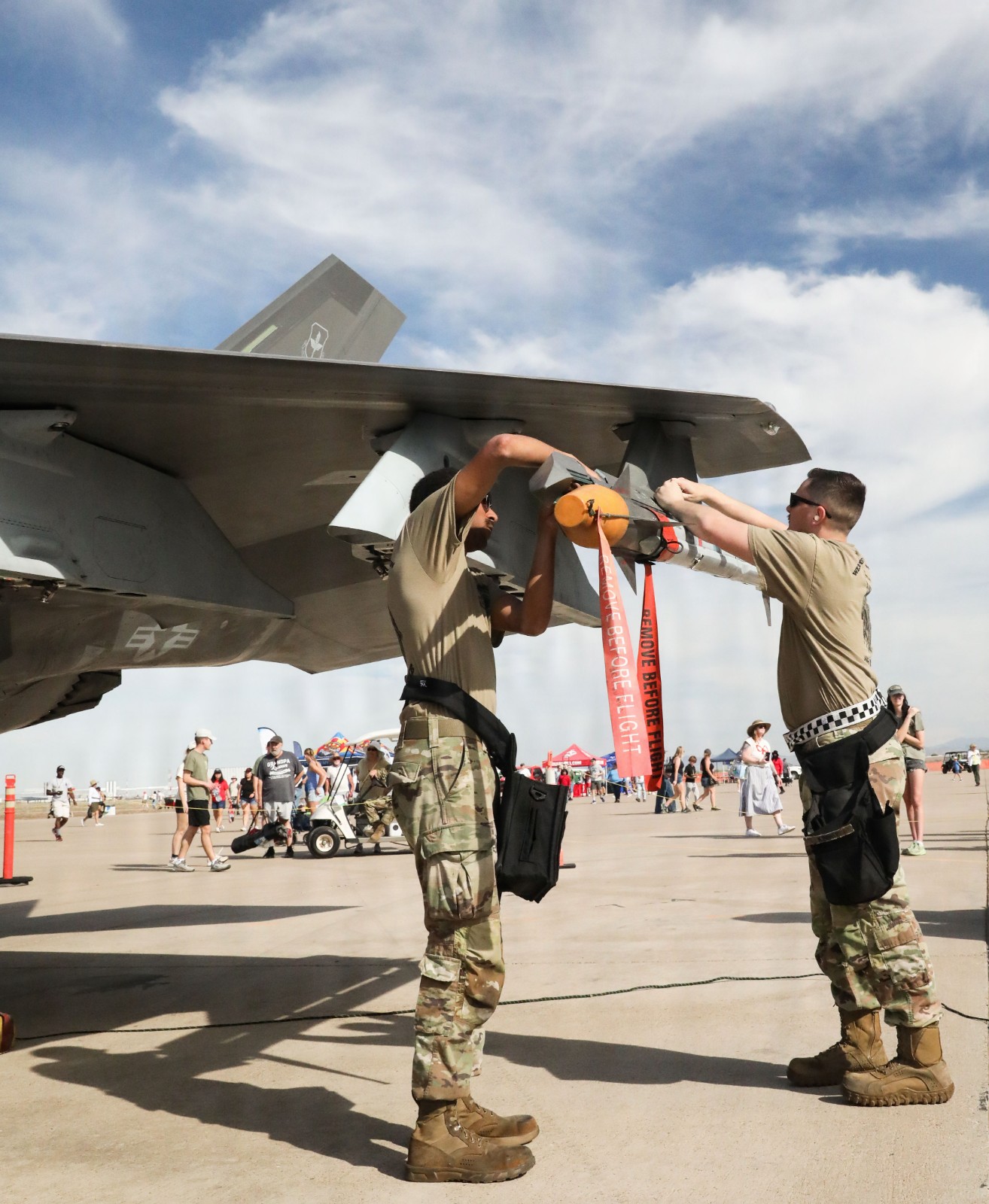 美國空軍地勤人員2026年3月於路克空軍基地為F-35A「閃電II式」匿蹤戰鬥機掛上AIM-9響尾蛇短程空對空飛彈。USAF