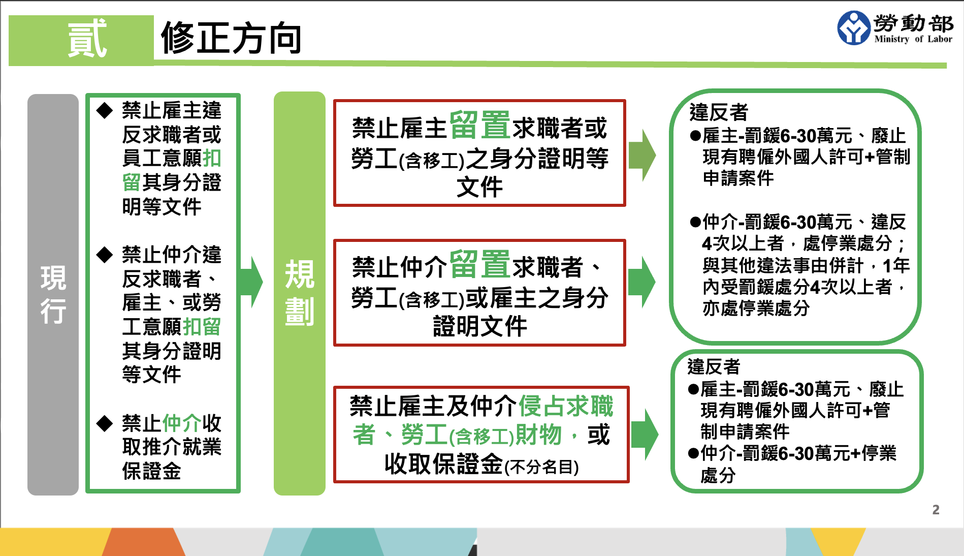 勞動部勞動力發展署副署長陳世昌指出,目前的規定是禁止仲介向求職者收取推介就業保證金。而這一塊修法是擴大它的一個管制的範圍。雇主跟仲介都不可以侵占求職者或勞工的財務,也不可以收取任何名目的保證金。違反的話,僱主的部分除了有相關的一個罰鍰,從6萬到30萬不等。另外如果雇主所留置的證明文件是屬於外國員工的部分的話,勞動部會進一步對於其聘僱許可去做廢止。另外也會管制後續他申請的案件。仲介的部分一樣也會有罰鍰的處分,情節累犯的話,會再做停業的處分。