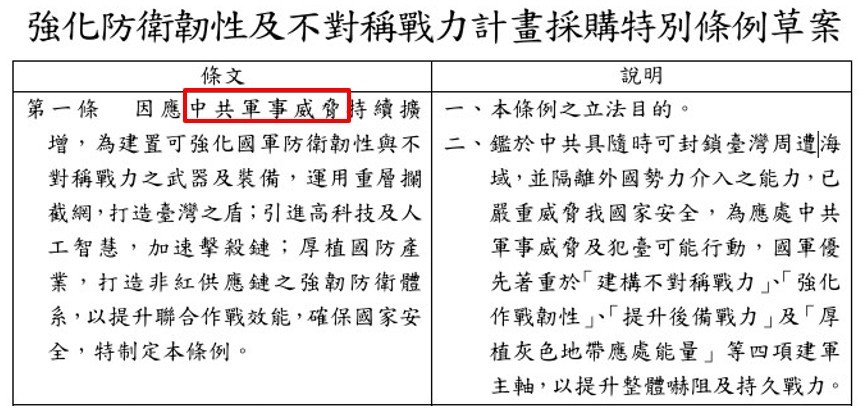 對此,民進黨立委林俊憲指出,法律案第一條通常即為「立法目的」,行政院版本明確寫明「因應中共軍事威脅持續擴增,為建置可強化國軍防衛韌性與不對稱戰力之武器及裝備,特制定本條例」。他質疑,若將「中共」刪除,改為較為模糊的「國際情勢」,「請問還有哪個國家會隨時軍事威脅台灣?」原本明確指向的威脅來源轉為模糊表述,恐淡化最關鍵的國防威脅。