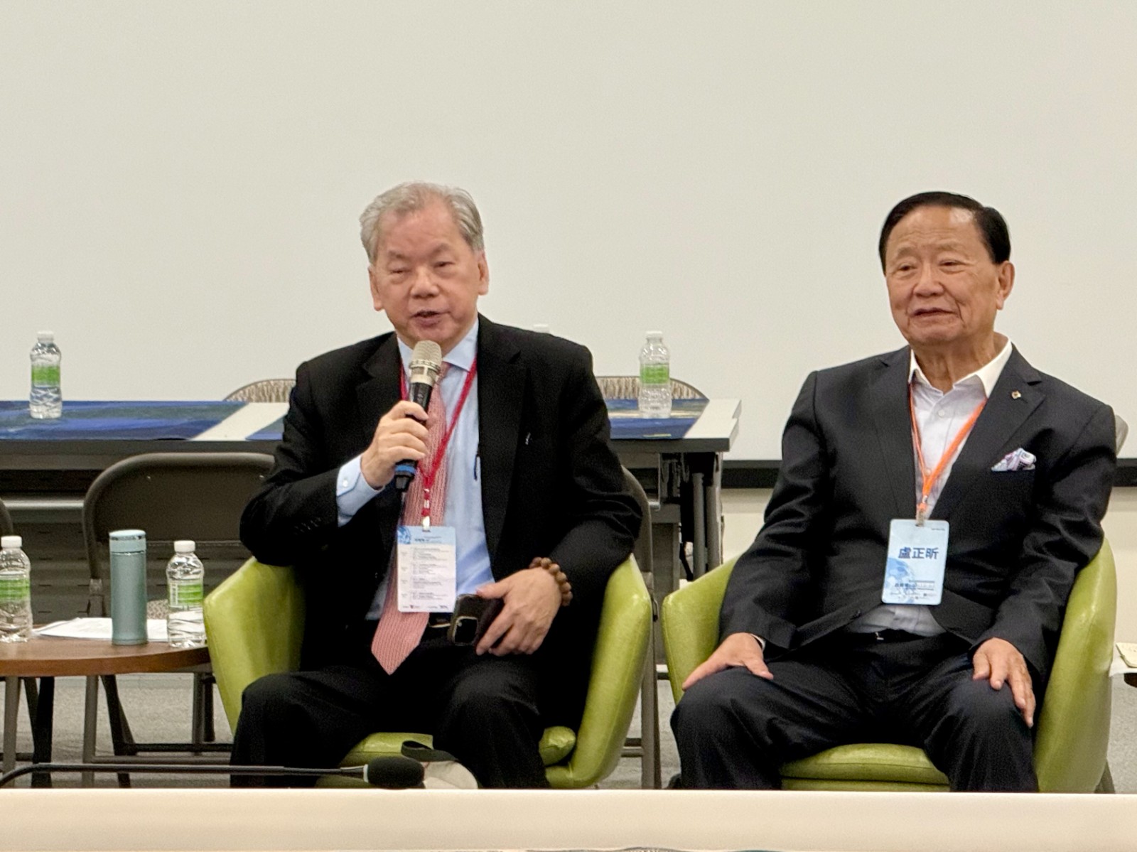 前永豐銀行資深副總經理陳松興(左)2026.4.16出席「2026TTX政經軍心情勢推演」第二天的經濟安全兵推。右為前永豐金控總經理、前永豐銀行董事長盧正昕。郭宏章攝