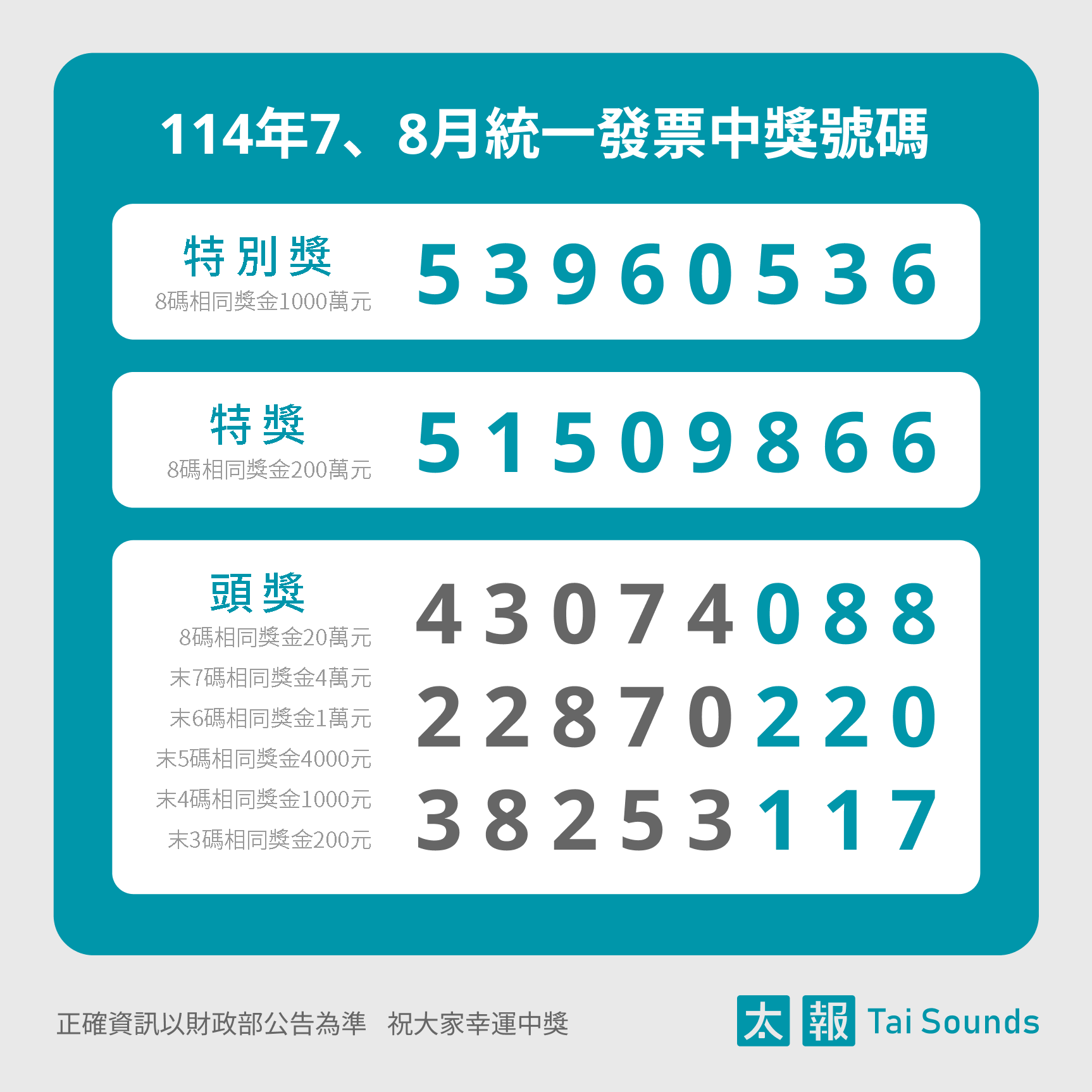 今年7-8月期統一發票獎今天(9/25)開獎,本期千萬獎獎號為「53960536」;200萬元特獎號碼為「51509866」。