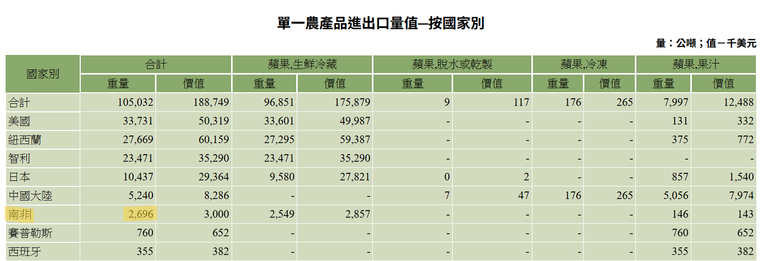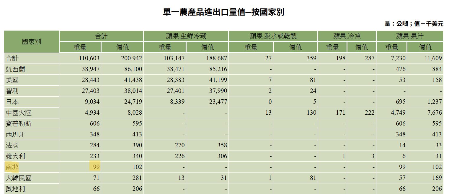 農業部公布2025年1-8月南非蘋果進口量,99公噸。取自農業部官網