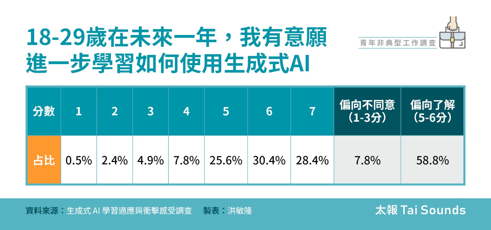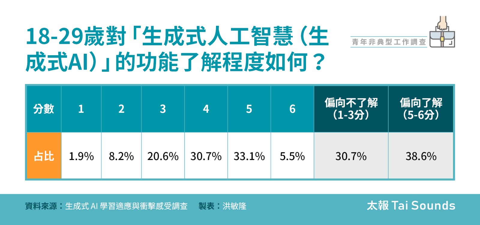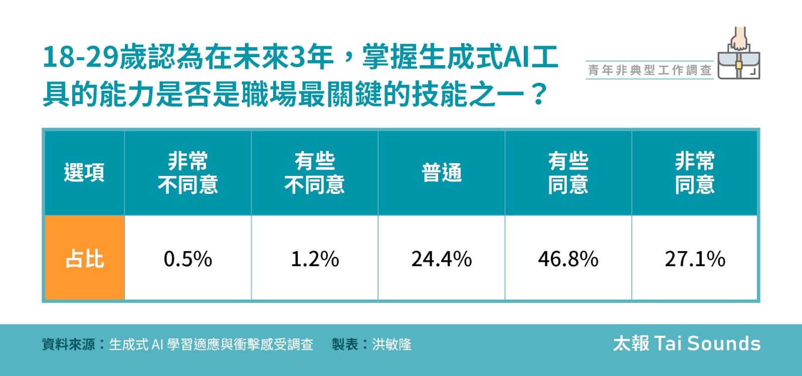 《太報》今年委託皮爾森數據公司所做的「生成式 AI 學習適應與衝擊感受調查」,即使是年輕族群(18-29)對生成式AI的功能也有3成(30.7%)偏向不了解,但在未來一年有意願進一步學習如何使用生成式AI的年輕族群有近六成(58.8%),認為在未來3年,掌握生成式 AI 工具的能力是否是職場最關鍵的技能之一,更有高達近7成4同意。