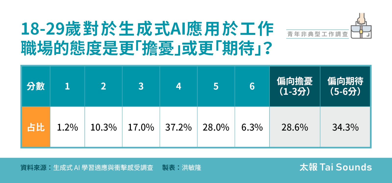 然而若問到對於生成式 AI 應用於工作職場的態度是更「擔憂」或更「期待」,仍是有近3成(28.6%)表示擔憂,顯示是否有機會或適當方式及管道學習以適應職場是有疑慮。