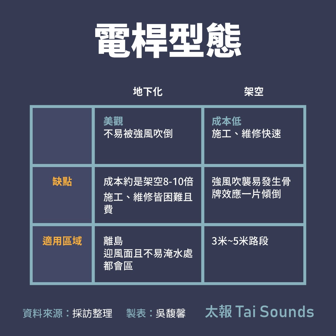 至於易淹水處,或暫時不便推動地下化之處,台電也有解方。陳銘樹表示,架空電網的中間,只要安插幾桿能耐17級強風的E級電桿,架空設備就能撐住,不致產生骨牌效應,就不會發生電桿連續傾倒,減少大規模停電發生機率。