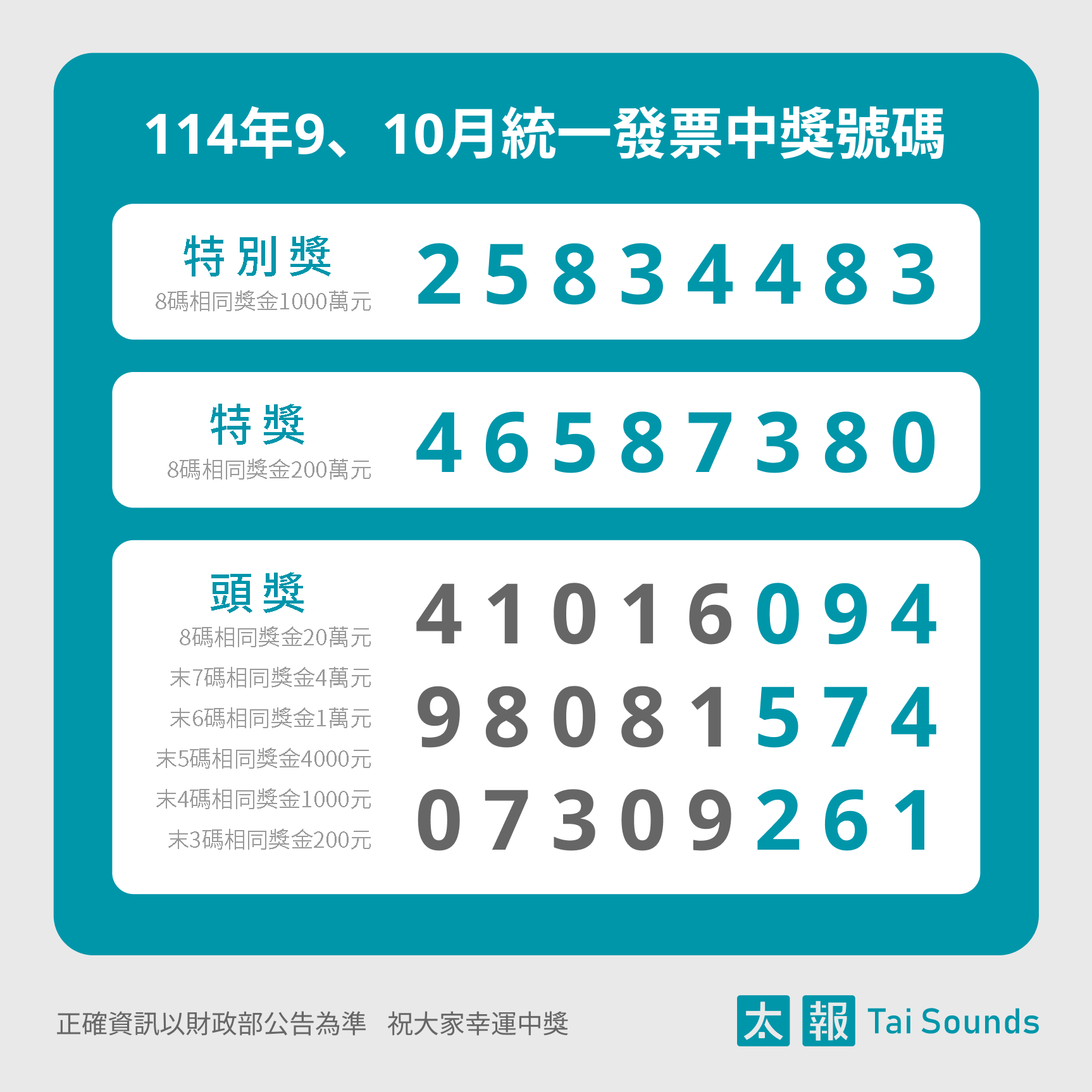 今年9-10月期統一發票獎11月25日開獎,本期千萬獎獎號為「25834483」;200萬元特獎號碼為「46587380」。