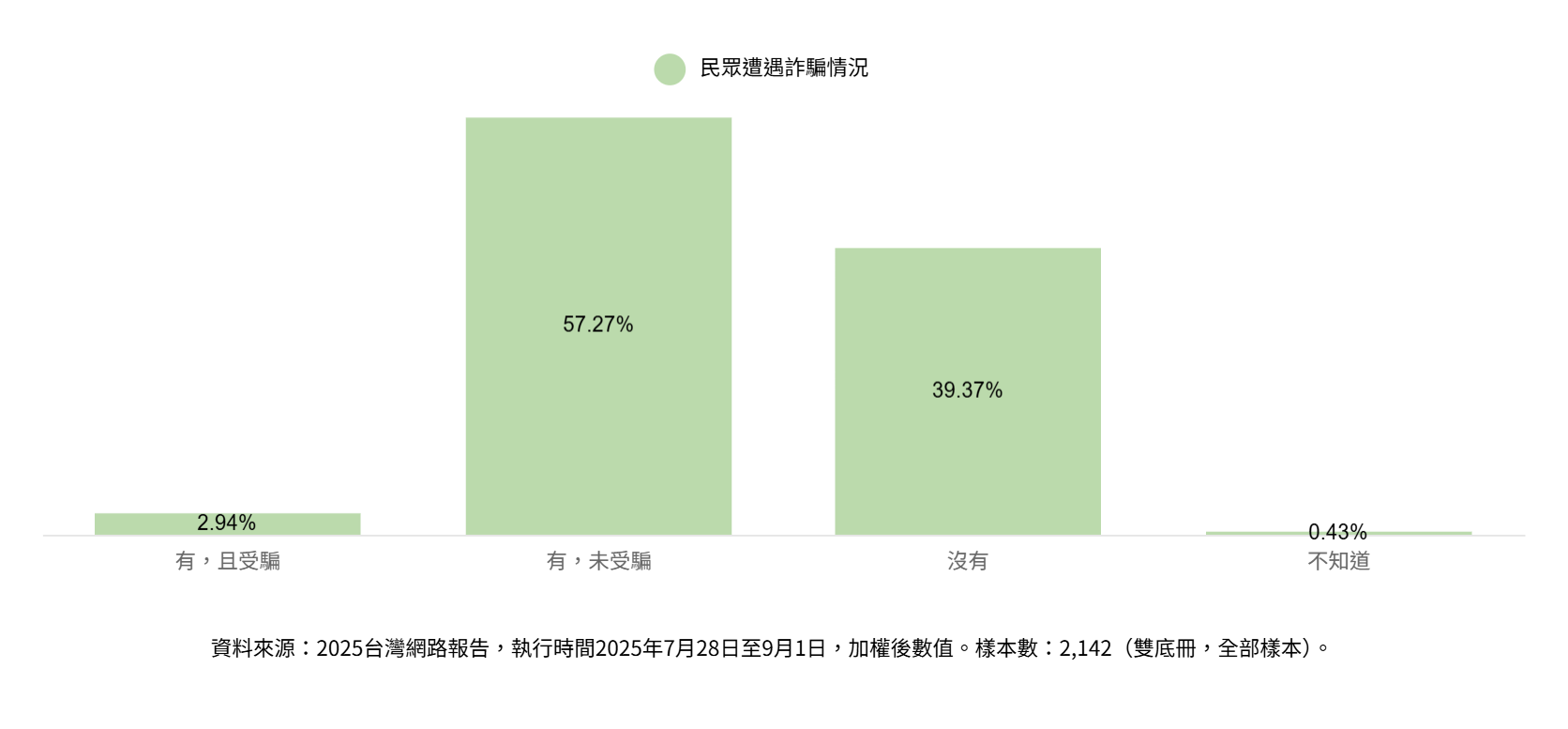 有57.27%民眾在過去三個月曾遭遇詐騙,更有2.94%遭詐且受騙。取自TWNIC
