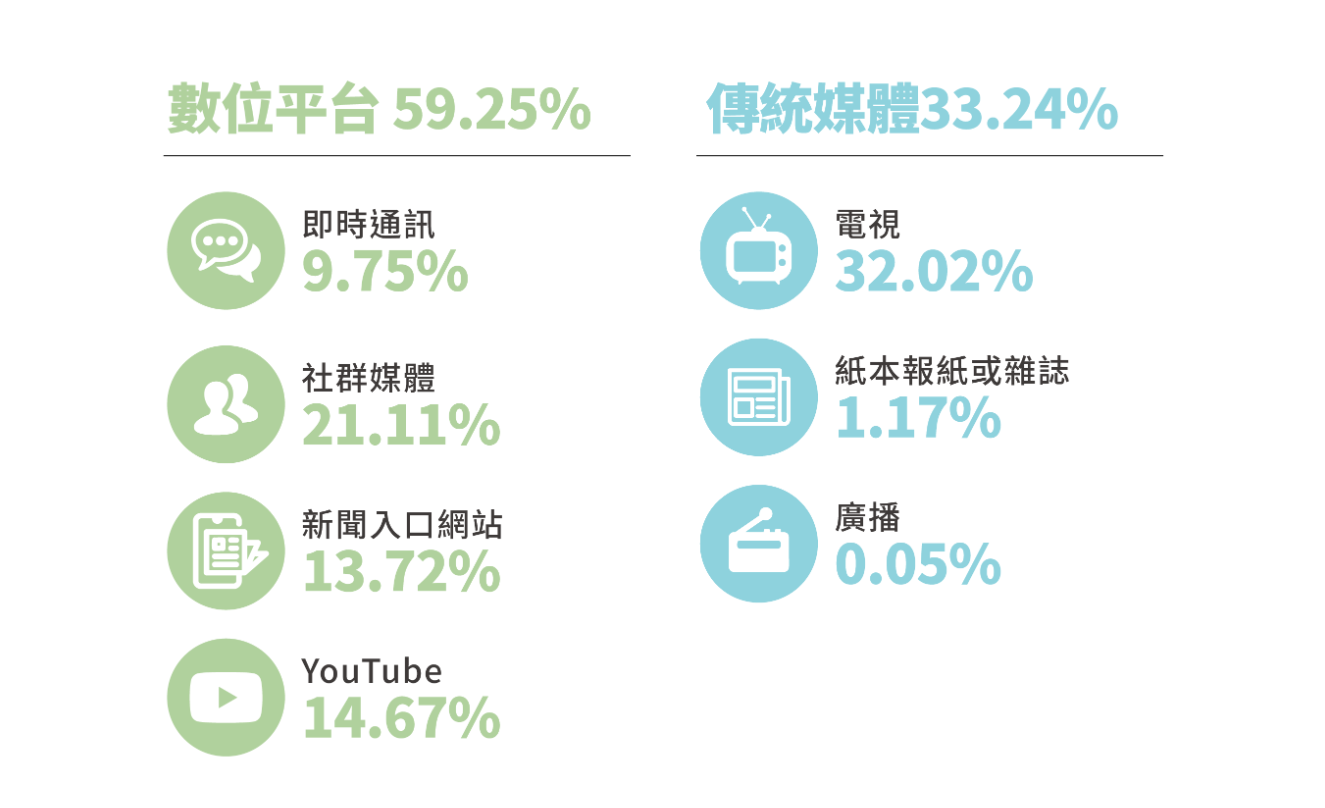 在數位平台中,社群媒體以21.11%居冠,YouTube以14.67%次之,新聞入口網站以13.72%居第三,即時通訊(如LINE)以9.75%排第四。