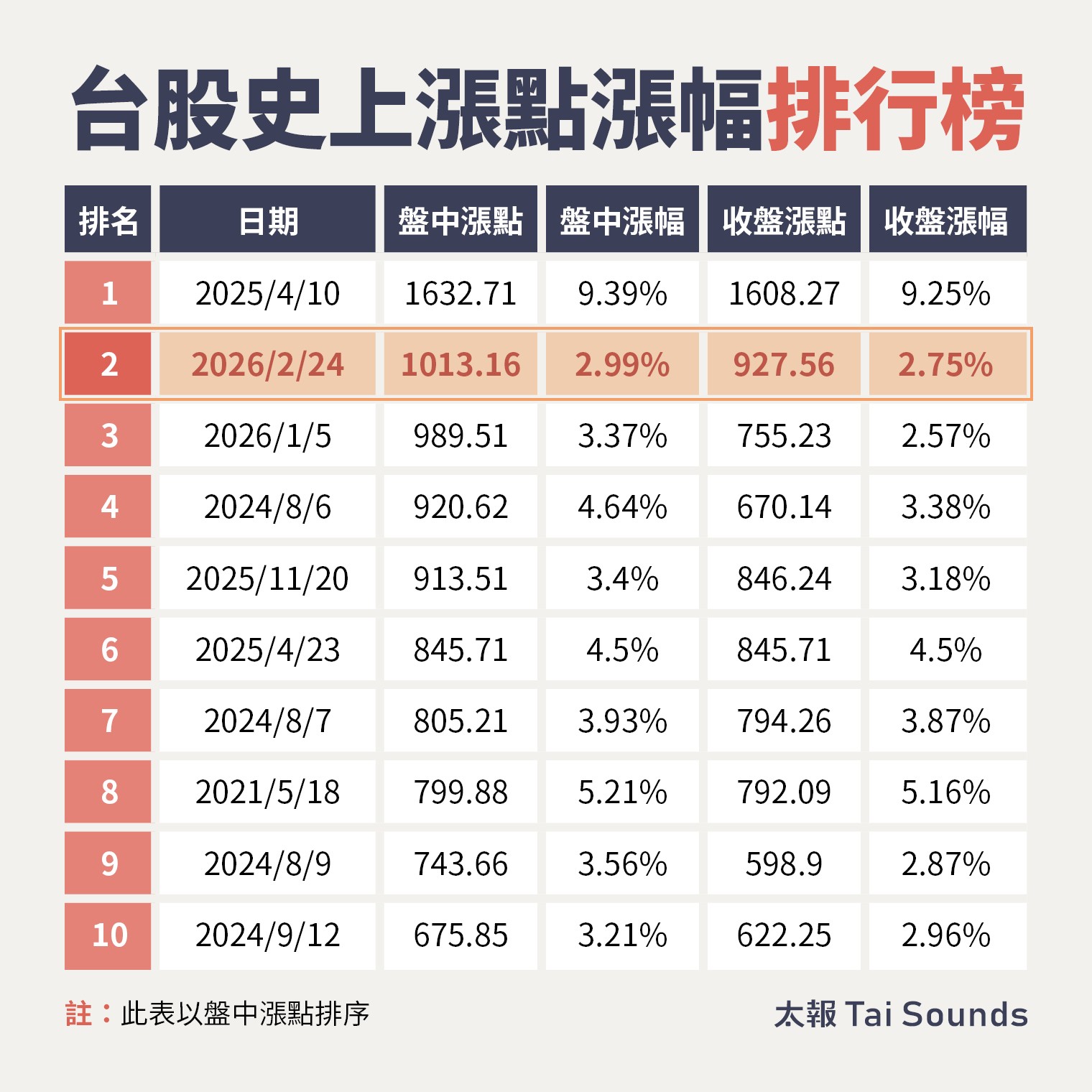 台股史上漲點漲幅排行榜。太報製表