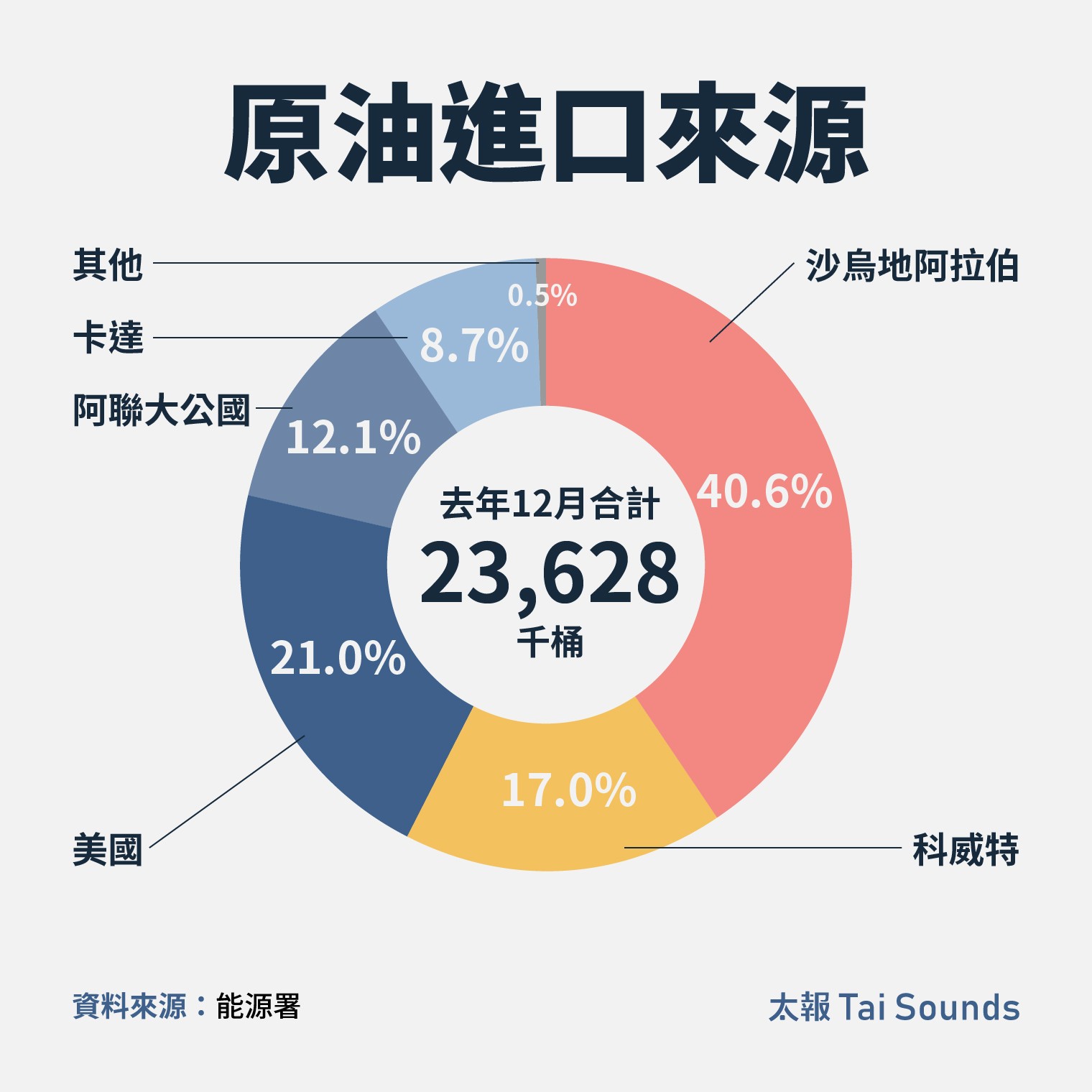 根據經濟部能源署統計我國最近的能源進口結構,在2025年12月台灣原油進口來源中,沙烏地阿拉伯占比40.63%居首,科威特16.98%,美國21.05%,阿拉伯聯合大公國12.13%,卡達8.67%。