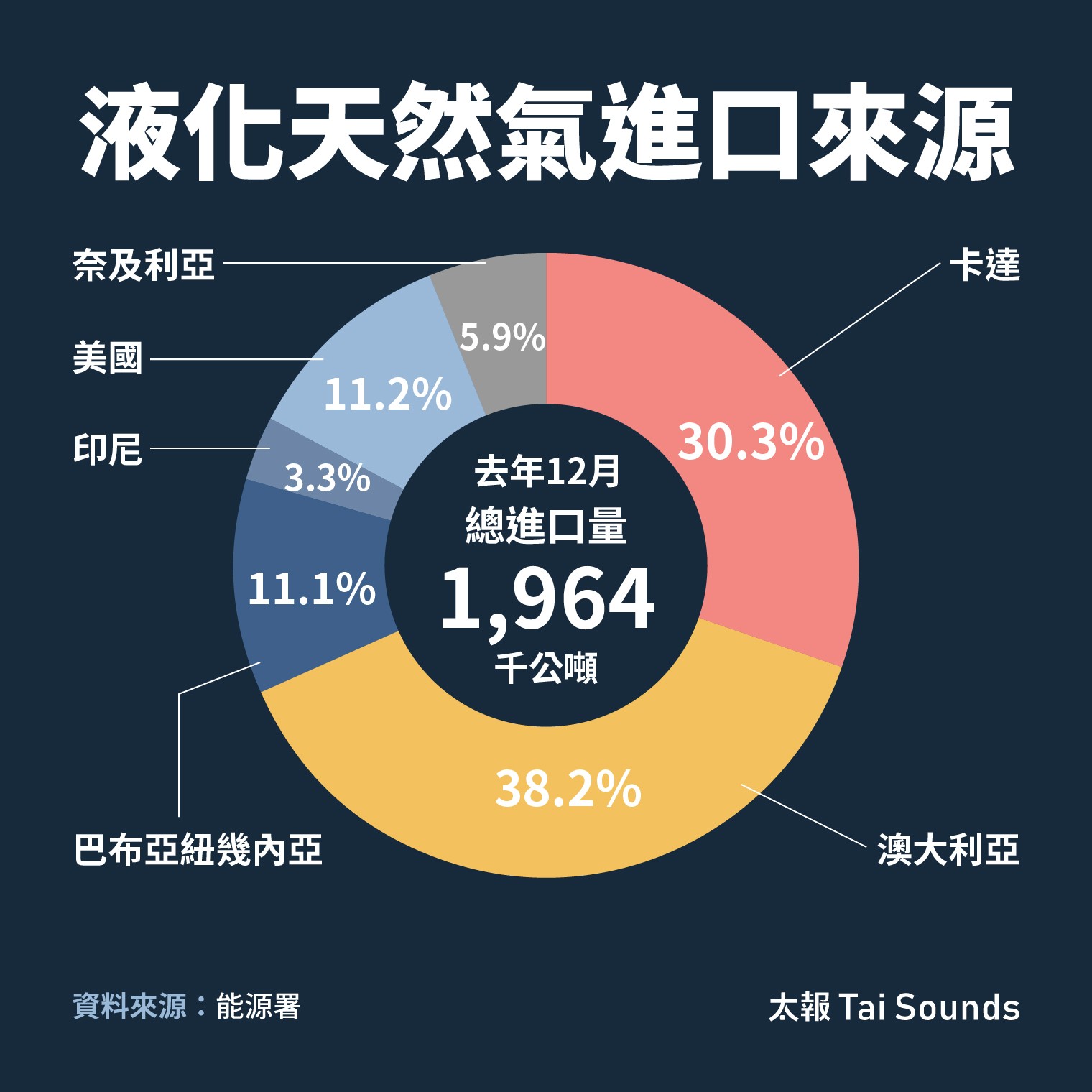 天然氣三成來自卡達 風險相對可控但不容忽視天然氣方面,台灣天然氣LNG進口來源以澳洲38.22%居首,卡達30.32%居次,美國約11.20%,巴布亞紐幾內亞11.06%,印尼3.26%,奈及利亞5.94%。其中僅卡達高度仰賴荷姆茲海峽出口,其餘國家多走太平洋或大西洋航線。