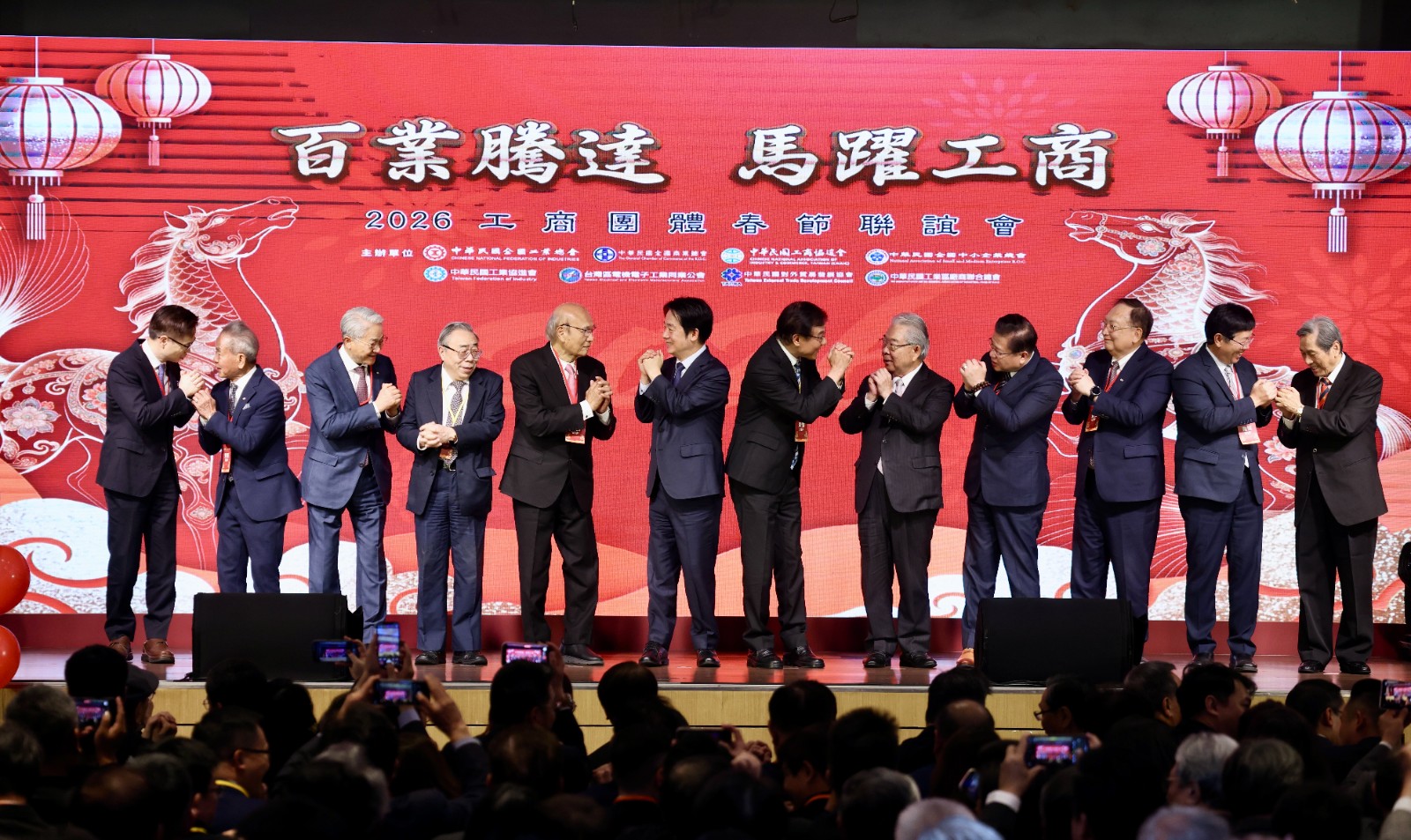 115年工商團體春節聯誼會,總統賴清德(左6)、海基會董事長蘇嘉全(右6)、工業總會理事長潘俊榮(左5)、工業總會榮譽理事長許勝雄(右5)、工業總會榮譽理事長王文淵(左4)、全國商業總會理事長許舒博(右4)、工商協進會理事長吳東亮(左3)、中小企業總會(全企總)理事長李育家(右3)、工業協進會(全國工協)理事長葉政彥(左2)、電機電子工業同業公會理事長劉揚偉(右2)、外貿協會董事長黃志芳(左1)、工業區廠商聯合總會許正雲(右1)進行新春團拜。李政龍攝