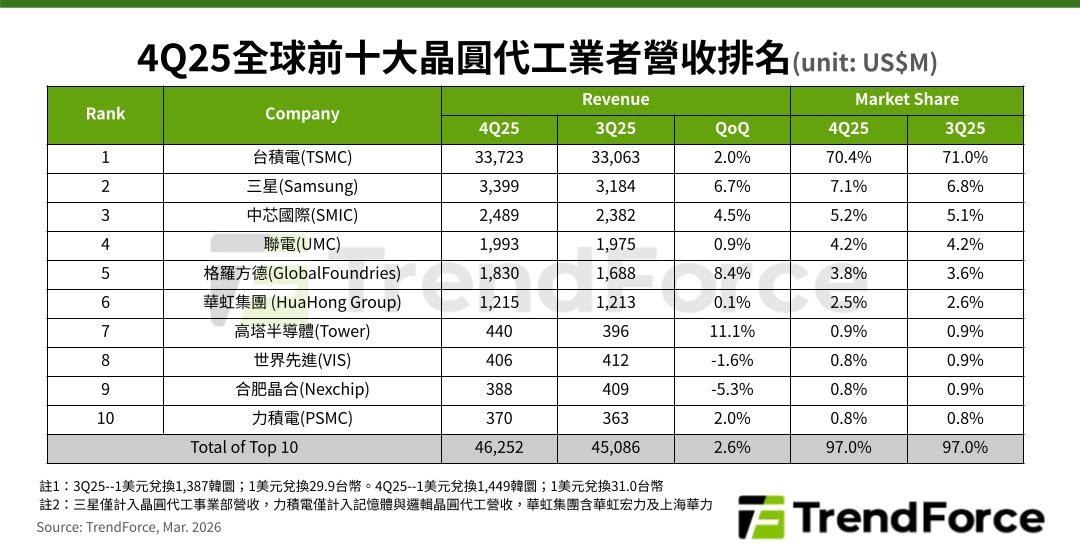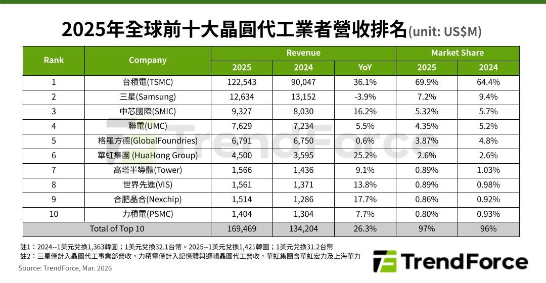 根據 TrendForce 提供的數據,2025年全球晶圓代工業者營收,台積電營收市占從前一年64.4%升至69.9%,大增5.5個百分點。三星從9.4%下降至7.2%;中芯國際則從5.7%小幅降至5.32%。