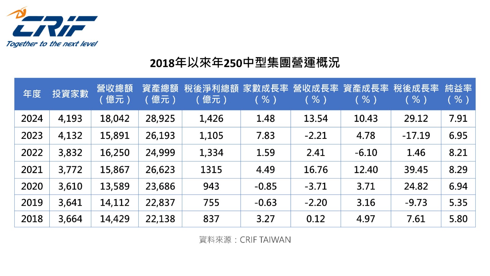 CRIF今天(4/14)發布《2026年版台灣中型集團企業研究》指出,在AI與全球需求復甦帶動下,台灣中型集團營運表現全面攀升,資產總額達2.89兆元、營收1.80兆元,連同稅後淨利與投資家數同步寫下歷史新高,四大核心指標齊創紀錄,整體營收成長率與資產績效更首度超越大型集團。