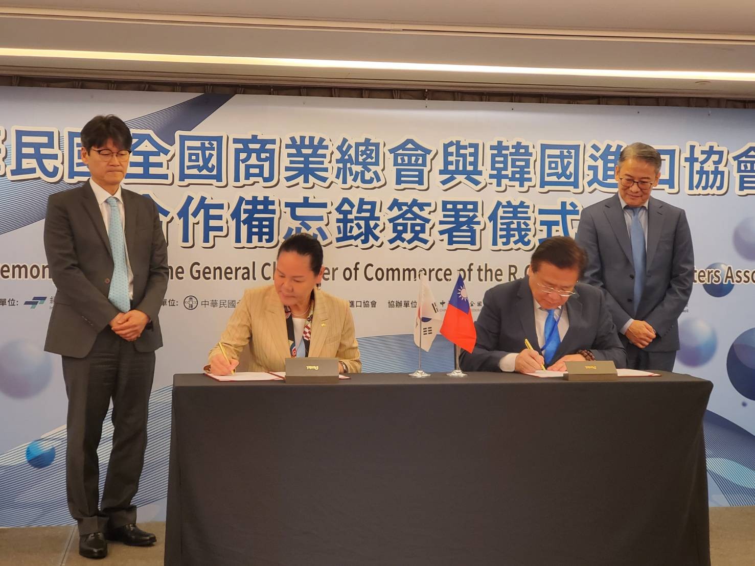 商總理事長許舒博與韓國進口協會會長尹英美正式簽署合作備忘錄(MOU),將以食品、觀光、健康醫療、美容美妝及遊戲等五大產業作為合作起點,透過資訊共享、企業媒合、市場拓展與共同參展等多元形式,推動實質交流與商機開發,在經濟部國際貿易署劉威廉署長及駐台北韓國代表部代理代表高尚郁共同見證下,象徵台韓產業合作邁向新里程碑,開啟雙邊經貿新篇章。