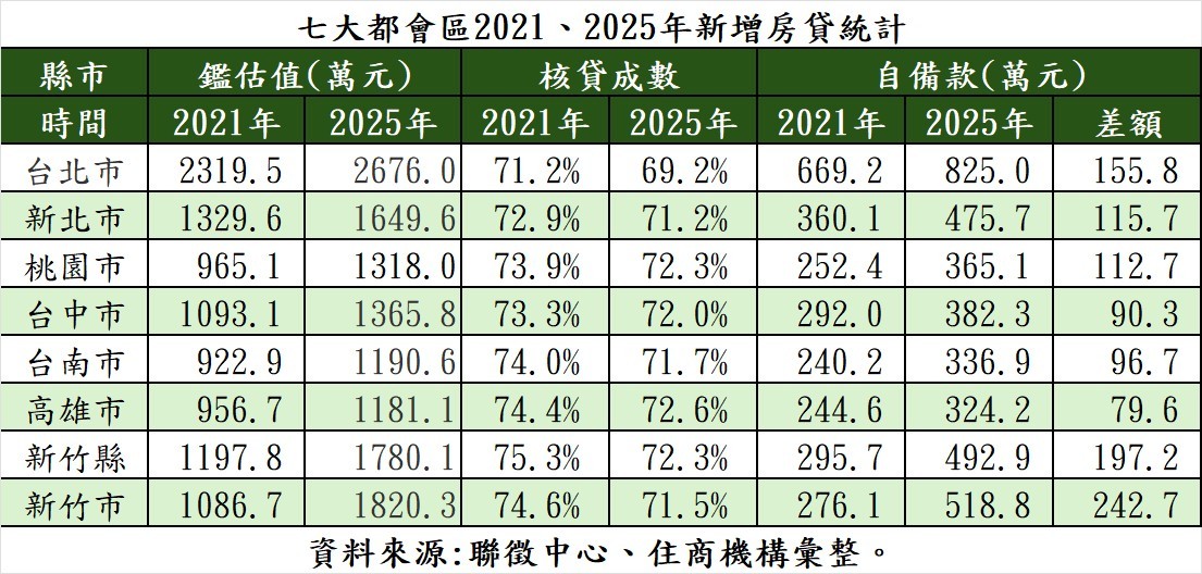 觀察聯徵中心數據,2025年七都當中,以台北市購屋門檻最高,若以房價漲勢來看,則以新竹縣市最高。住商機構提供