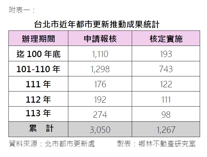 根據北市府統計,截至2024年底,北市都更案累計報核達3050件,去年報核案274件,年增42.7%,持續創高。鄉林不動產研究室提供