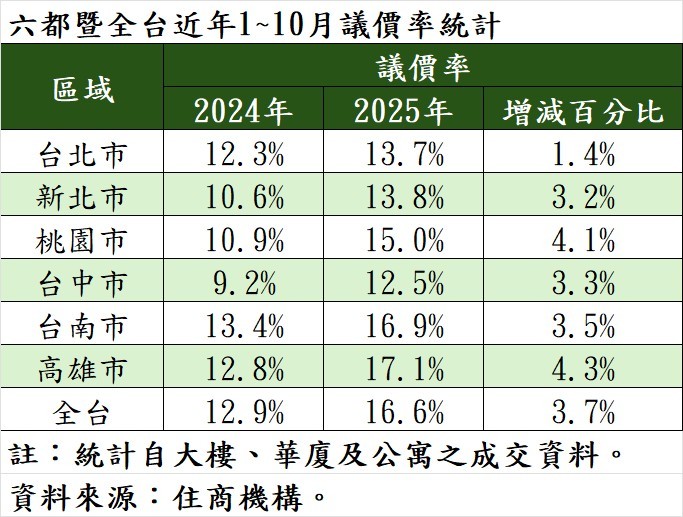 據統計,六都與全台議價率全面起漲,其中台北市今年前10個月成交案件平均議價率達13.7%,相較去年同期增加1.4個百分點;新北市議價率則從10.6%增至13.8%,增加3.2個百分點;桃園市議價率前10個月平均達15.0%,較去年增加4.1個百分點。
