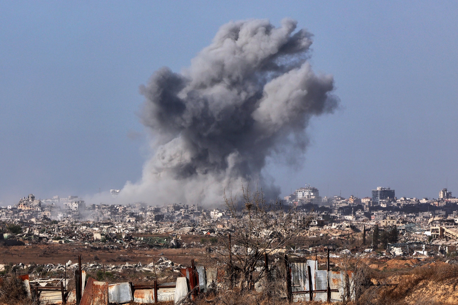2025年10月3日,以軍轟炸加薩市,冒出滾滾煙塵。美聯社