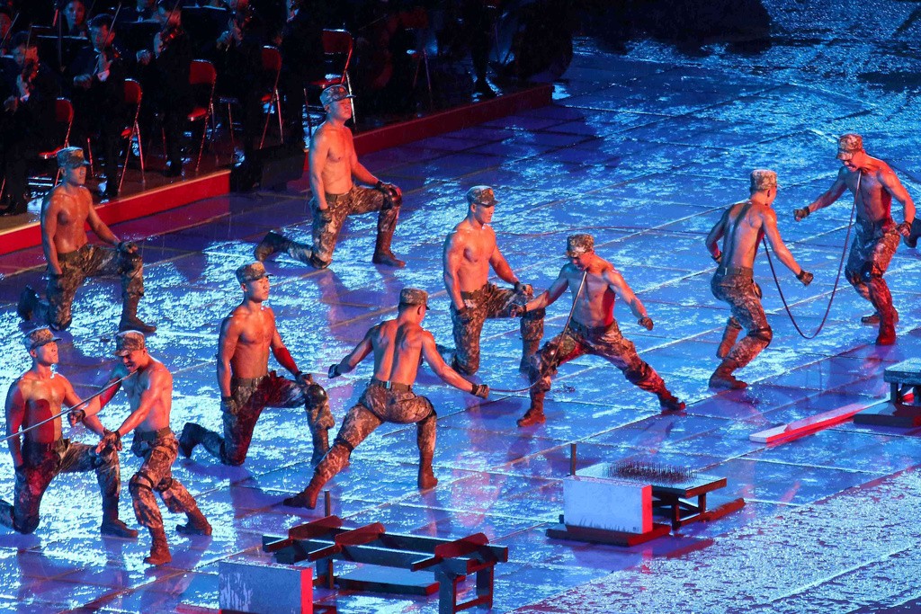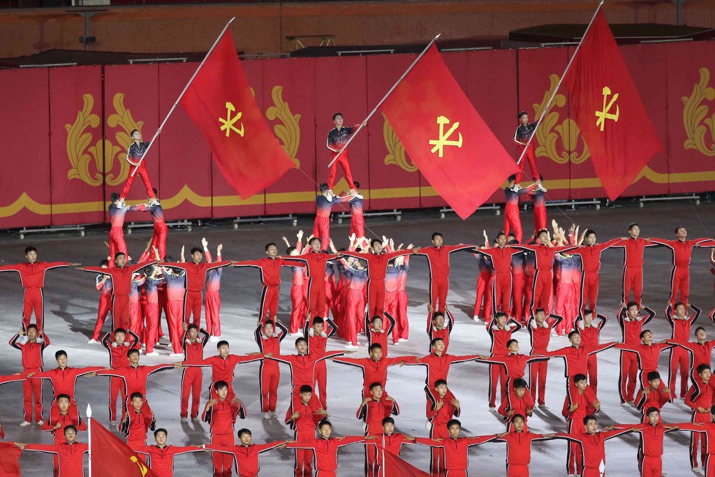 北韓勞動黨10月10日慶祝創黨80週年,首都平壤舉行盛大慶祝活動,現場有歌舞及體操表演,演出者揮舞北韓國旗。美聯社