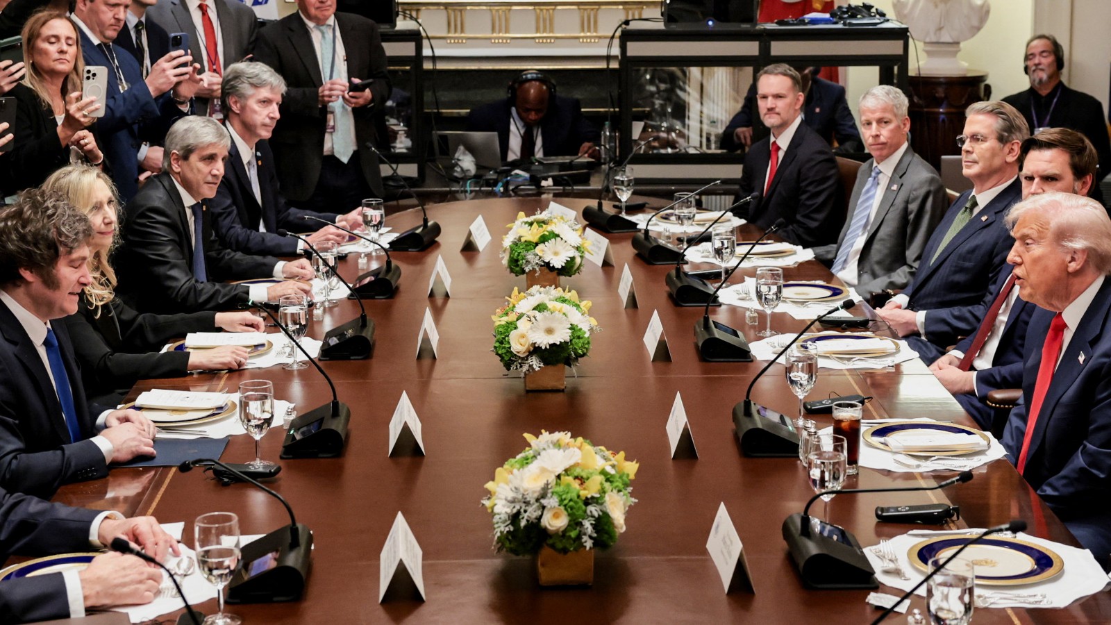 2025年10月14日,美國總統川普與副總統范斯在白宮與阿根廷總統米雷伊舉行會談。路透社