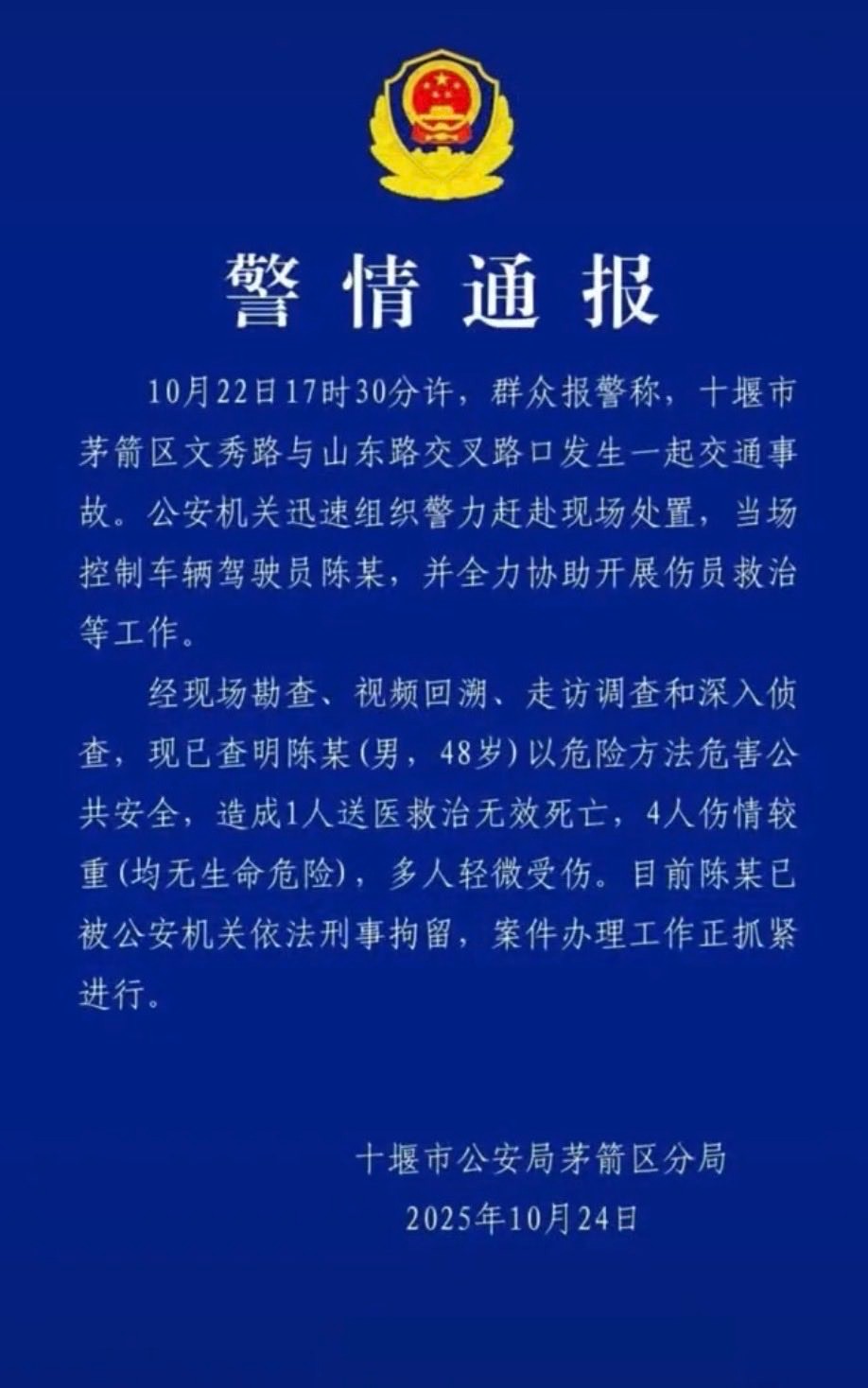 通報稱,經現場勘查、影片回溯、走訪調查和深入偵查,已查明陳某(男,48歲)以危險方法危害公共安全,造成1人送醫死亡,4人傷情較重(均無生命危險),多人輕微受傷,「目前陳某已被公安機關依法刑事拘留,案件辦理工作正抓緊進行」。但通報中並未提供死傷者具體資料。
