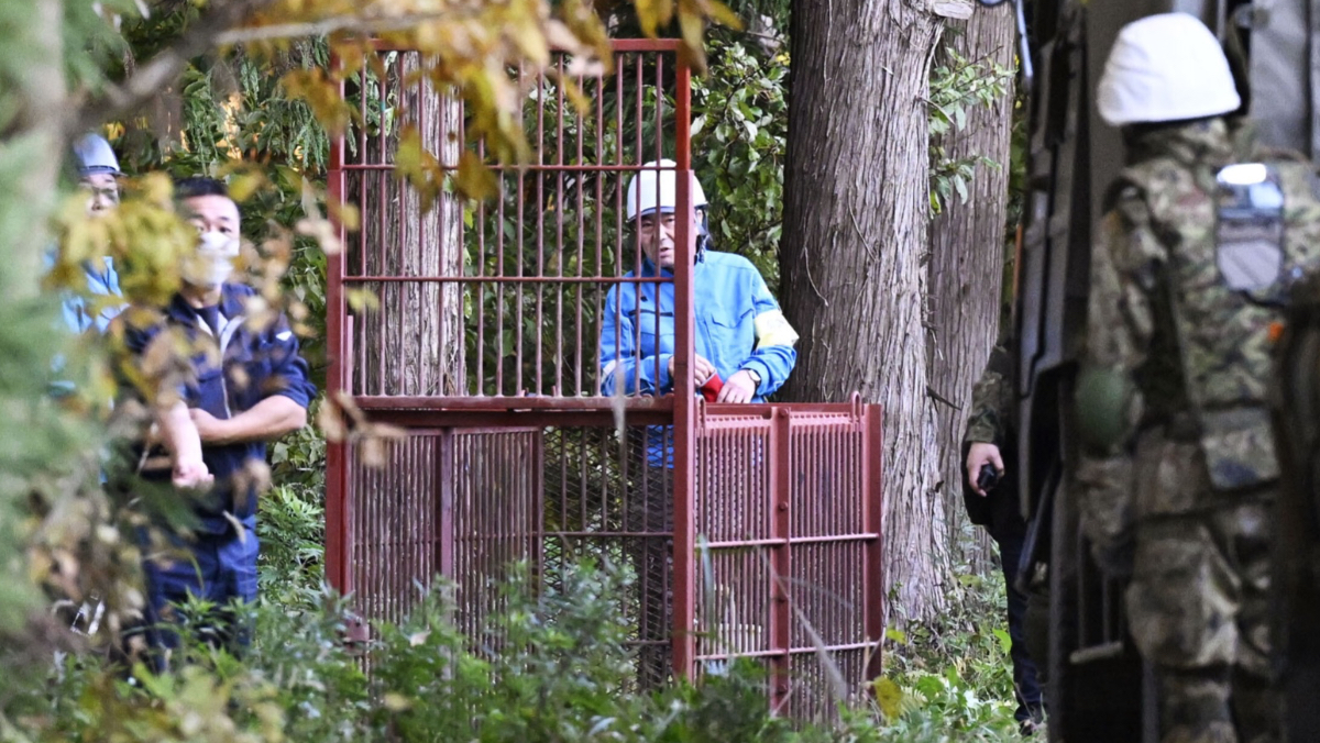 2025年11月5日,日本自衛隊員在秋田縣鹿角市幫忙設捕熊陷阱。美聯社