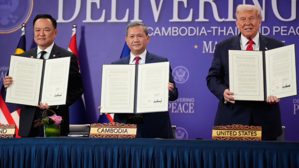 泰柬兩國7月下旬發生致命衝突,持續5天,造成至少43死,雙方共逾30萬平民流離失所。在馬來西亞斡旋下,泰柬兩國在7月底已達成停火,並於10月26日在美國總統川普見證下簽署和平協議,川普稱讚自己「喜歡、也擅長促和」。