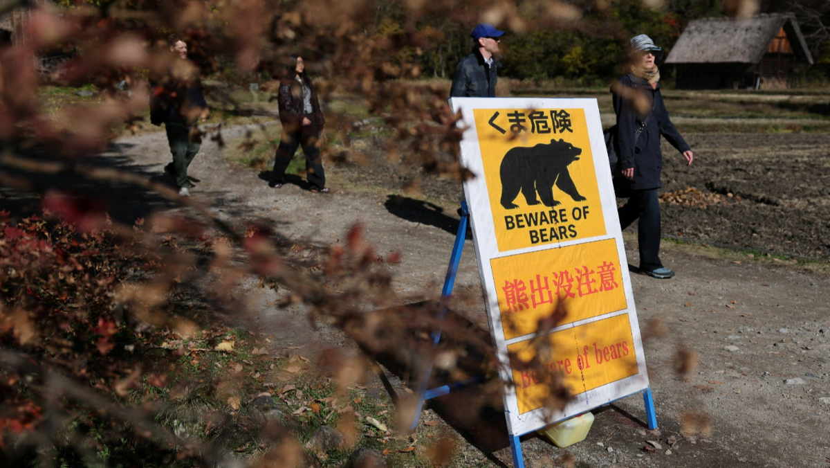 札幌市圓山動物園重新開放不到一天,又有民眾在附近目擊熊。圖為日本岐阜縣大野郡白川村,設有「熊出沒注意」的警告標示。路透社資料照