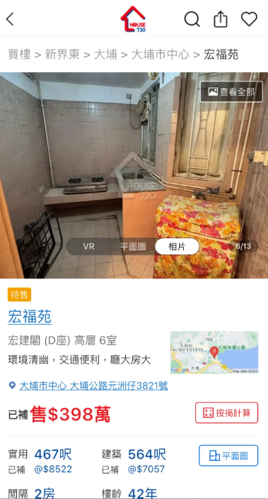 香港網友於LIHKG論壇貼出「香港置業網」House730過去的售屋紀錄,顯示該物件為「大埔市中心宏福苑宏建閣(D座)高層6室」,開價398萬港元(約新台幣1558萬元),屋齡42年,標榜「環境清幽、交通便利、廳大房大」。