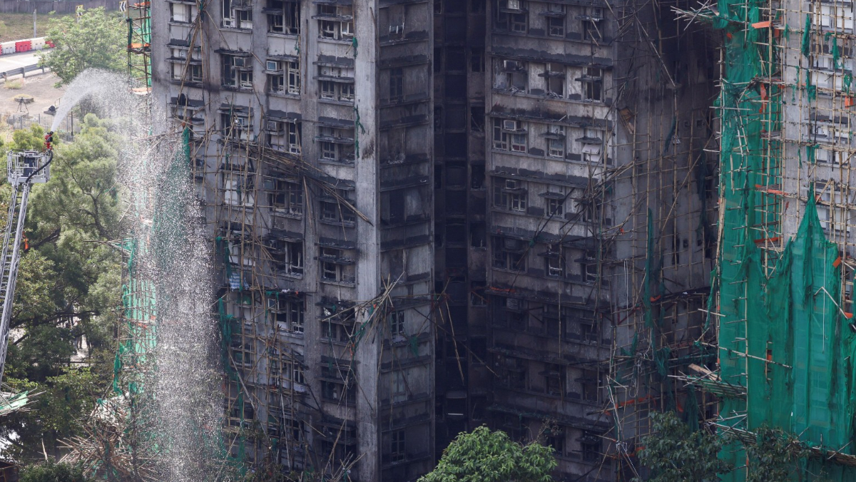 2025年11月28日,香港大埔宏福苑大火第三天,建築已燒得焦黑。有消防人員自大樓殘骸內抬出罹難者屍體。路透社