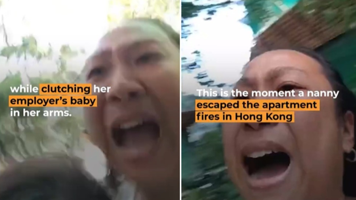 一名菲律賓籍幫傭抱嬰狂奔22樓,還不忘開直播提醒宏福苑的居民。翻攝IG/aljazeeraenglish