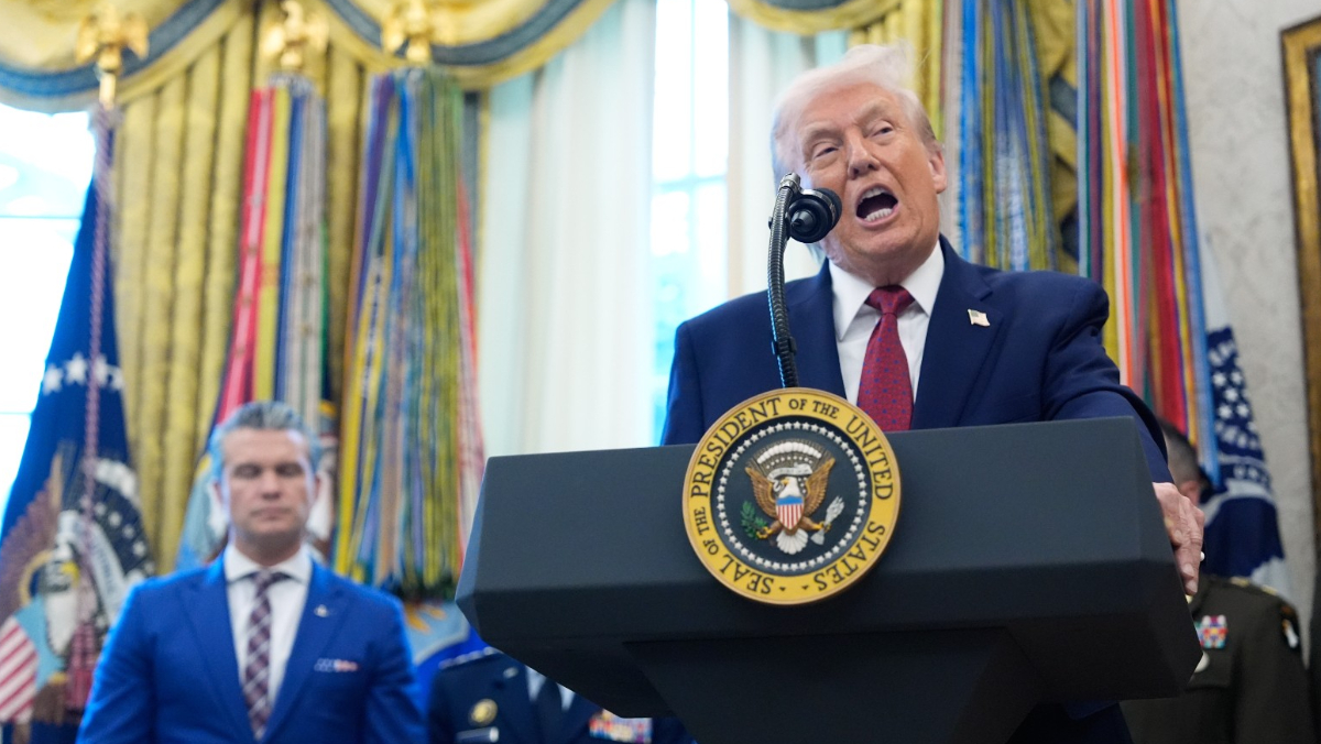 2025年12月15日,美國總統川普在白宮的授勳儀式上發表演說,國防部長赫格塞斯在旁聆聽。美聯社