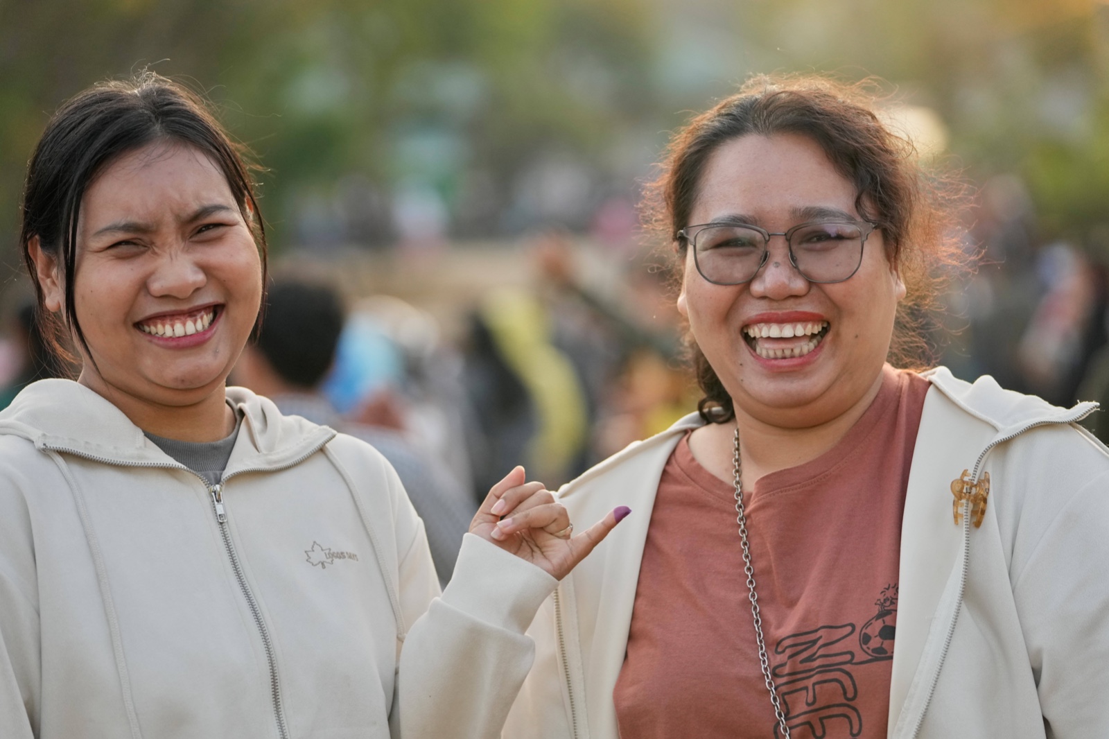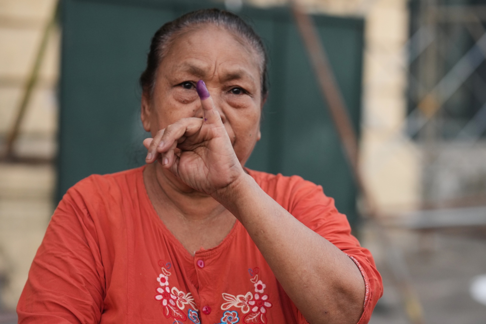 2025年12月28日,緬甸舉行5年來首次大選的第一階段投票,投完票民眾秀出沾過墨汁的小指。美聯社