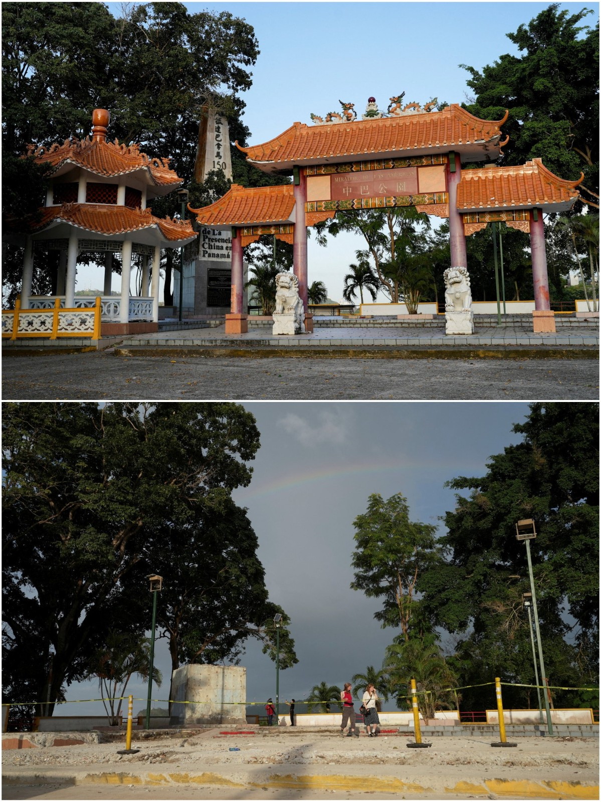 位於巴拿馬首都巴拿馬市郊,坐落於「中巴公園」的「華人抵達巴拿馬150周年紀念碑」,12月27日晚間突遭拆除。圖為12月29日公園與紀念碑拆除前後的對照。路透社