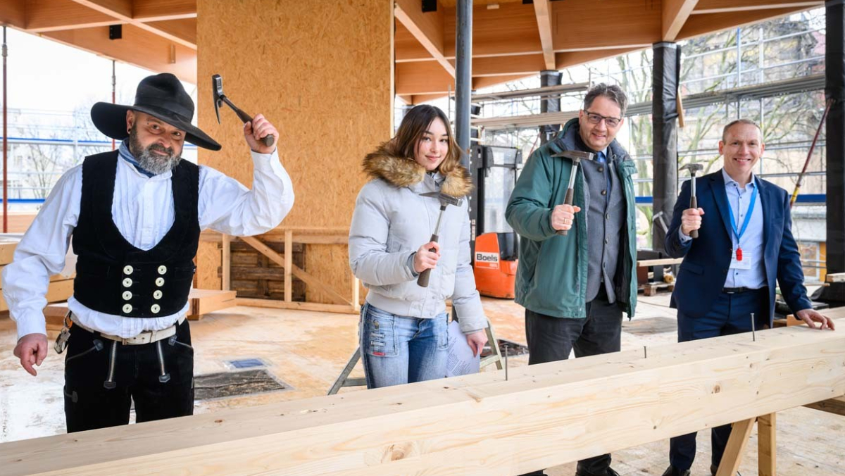 德勒斯登國際學校(Dresden International School, DIS)上週舉行新校舍上樑典禮,校方與學生代表共同揮動德國傳統上樑儀式木槌,象徵新校舍建築工程順利完成過半。