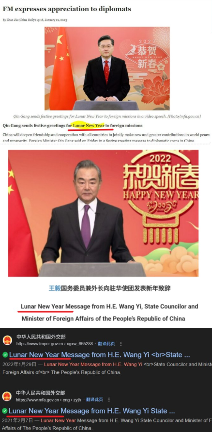 然而,有網友與旅義華裔作家李穎(網名「李老師不是你老師」)整理中國外交部歷年公開的英文資料後指出,中國官方其實長期混用「Chinese New Year」與「Lunar New Year」,並未一致採用前者。實際查詢中國外交部英文官網,可發現多篇正式新聞稿直接以「Lunar New Year」為標題,顯示該用語在中國官方體系內並非禁忌。