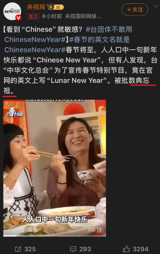 中國央視旗下節目《看台海》日前報導指出,春節在國際社會中的通用英文說法為「Chinese New Year」,並點名台灣文總刻意改用「Lunar New Year」去中國化,報導中還引述國民黨桃園市議員詹江村的說法,批評文總「數典忘祖」,強調春節是中國人固有的傳統文化,無須刻意更改稱呼。