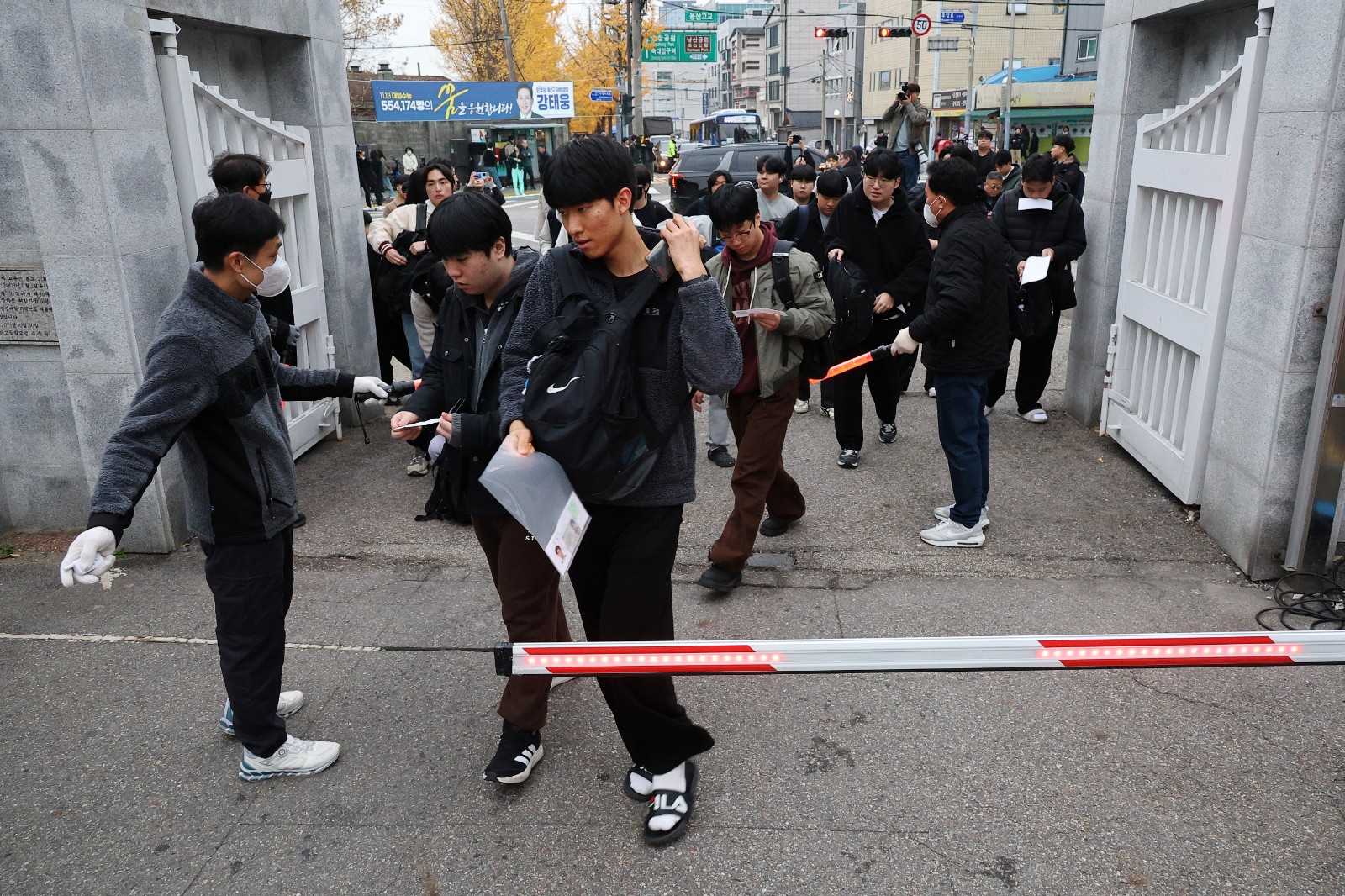 圖為2025年11月13日,南韓大學入學測驗,學生們陸續進入考場。路透社資料照