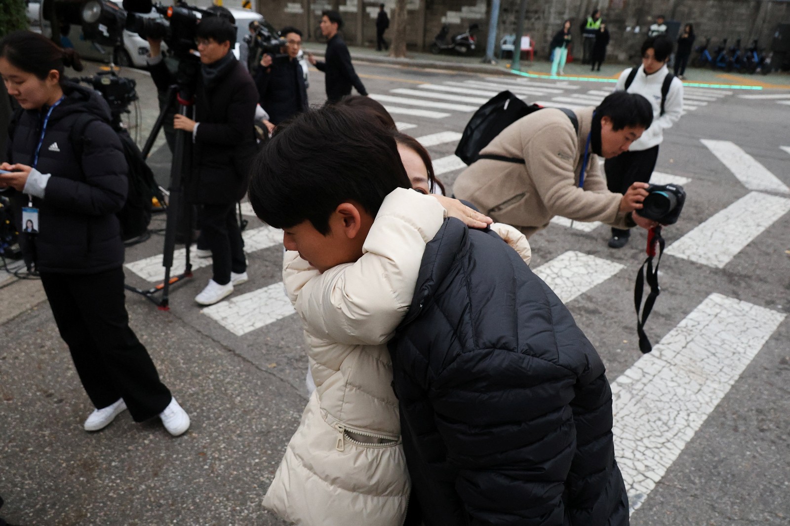圖為2025年11月13日,南韓大學入學測驗,有母親擁抱應試的兒子。路透社資料照