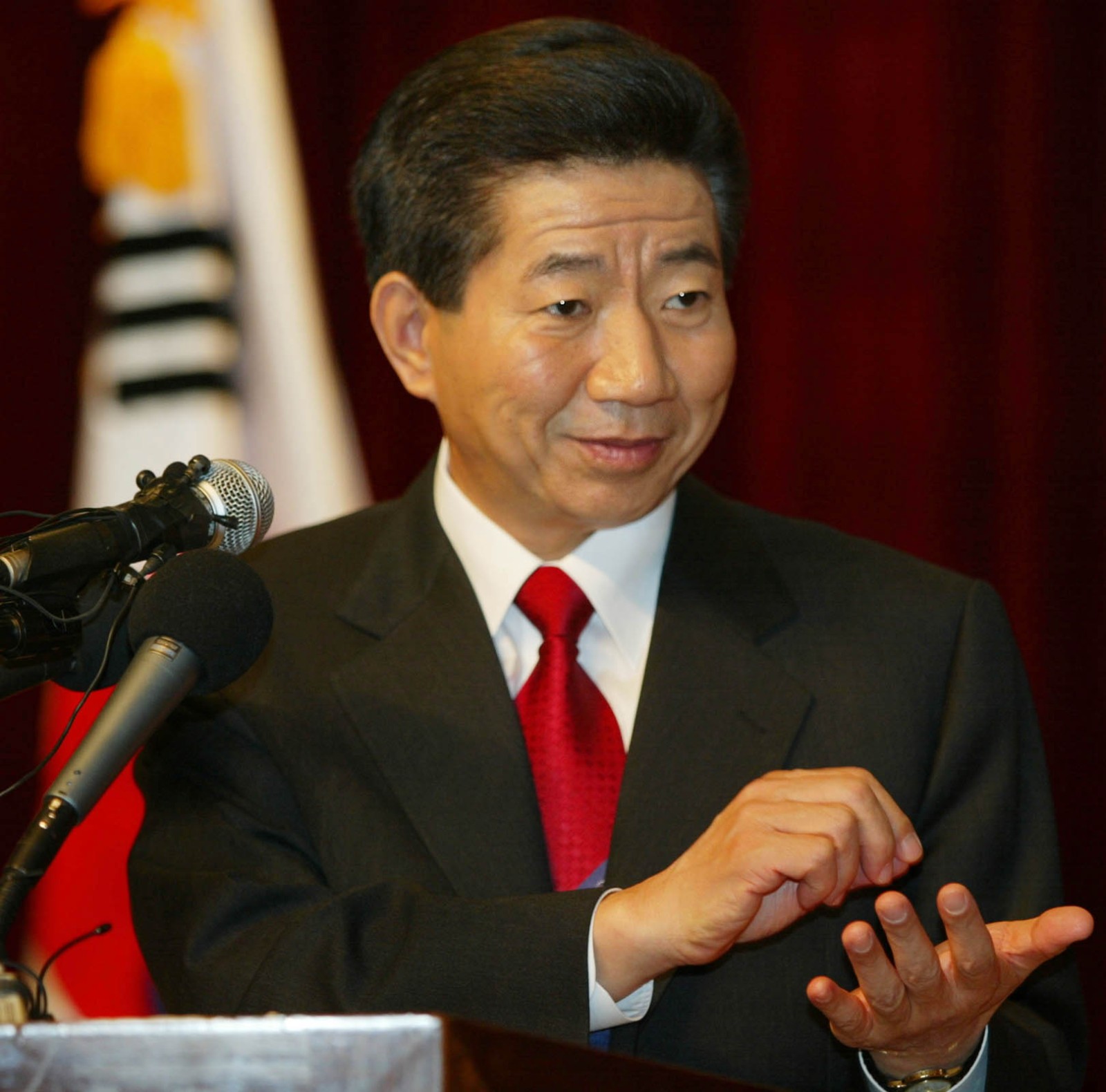 圖為2002年12月20日,盧武鉉贏得南韓總統大選的隔天召開記者會。美聯社資料照