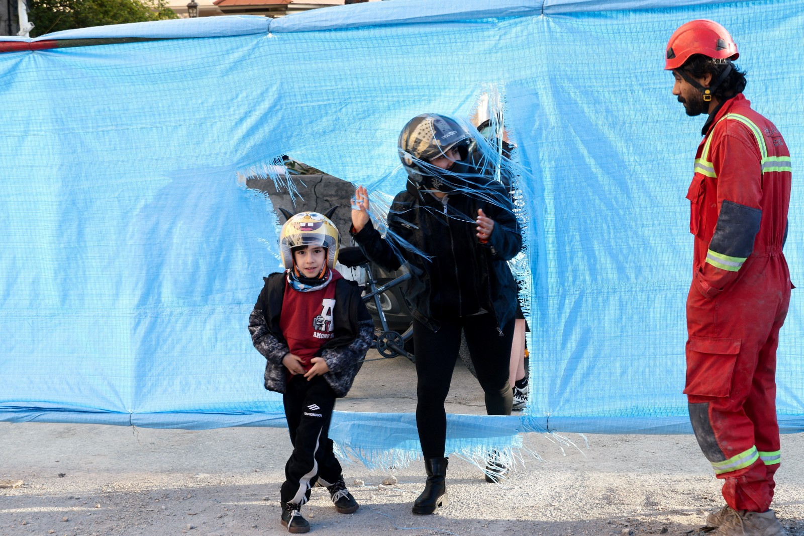2026年3月21日,伊朗德黑蘭一對母子戴著安全帽,行經一棟在空襲中被摧毀的建築物旁。路透社