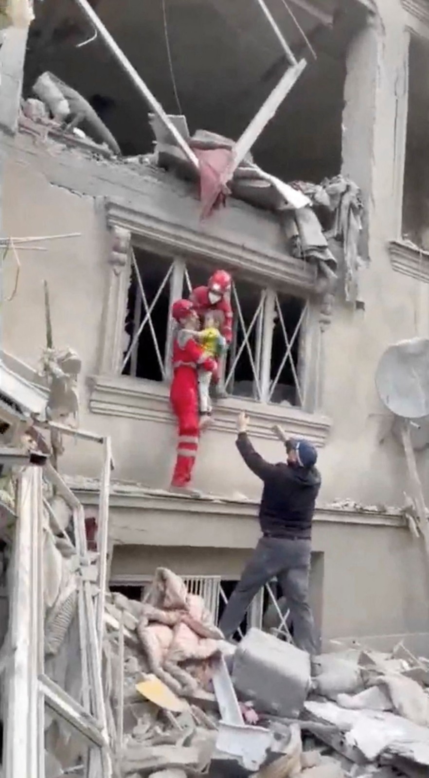 2026年3月23日,伊朗紅新月會發布影片,救援人員從德黑蘭一棟受襲的建物中救出一名兒童。路透社