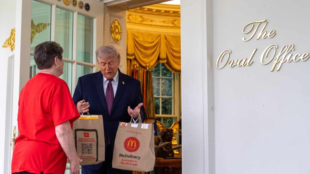 美國白宮安排外送員送麥當勞到橢圓辦公室,讓川普宣傳小費免稅政策。美聯社